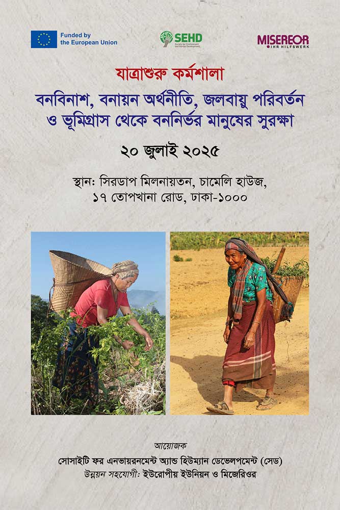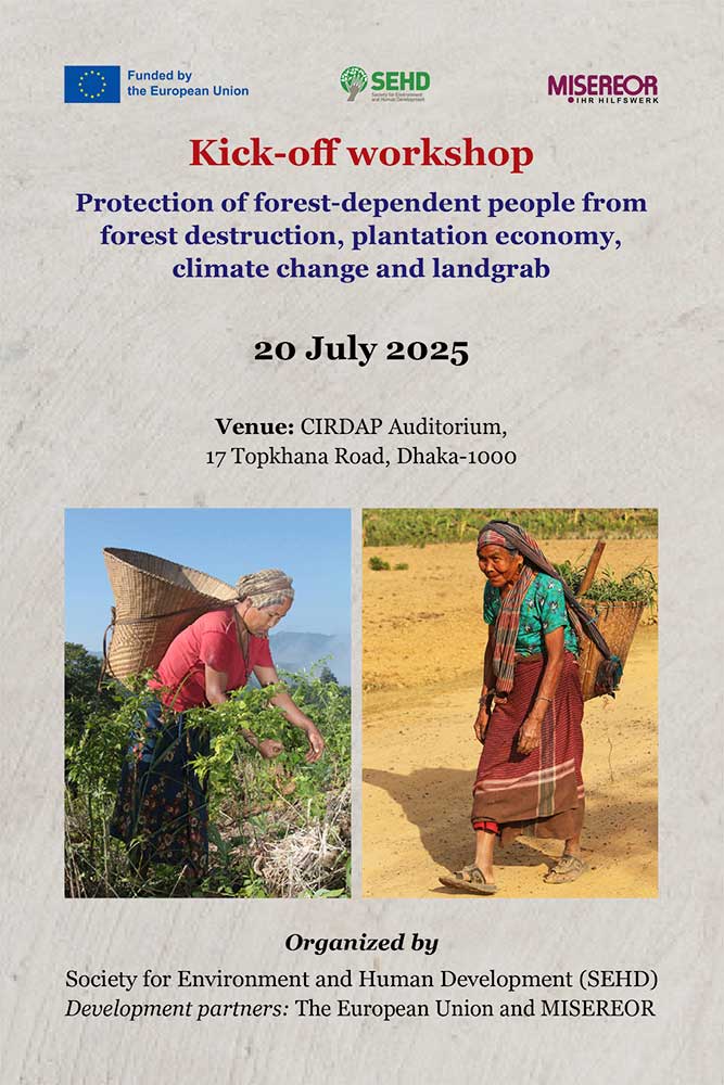 The pressing issues and core concerns for the indigenous peoples and other forest-dependent peoples living in the forest regions of the Chittagong Hill Tracts (CHT) and the north-central districts of Tangail, Gazipur, and Mymensingh are centered around forests and land.The Society for Environment and Human Development (SEHD) has been working for more than three decades for the protection of forest and forest-dependent peoples. Cashing in on the valuable knowledge resources and experience on the issues concerning forest and forest people, SEHD has initiated a 42-month project from February 1, 2025 to study the current state of the forest, forest commons, condition of the communities living in the forest areas and to develop a roadmap for promotion of customary rights of the indigenous and forest-dependent people.